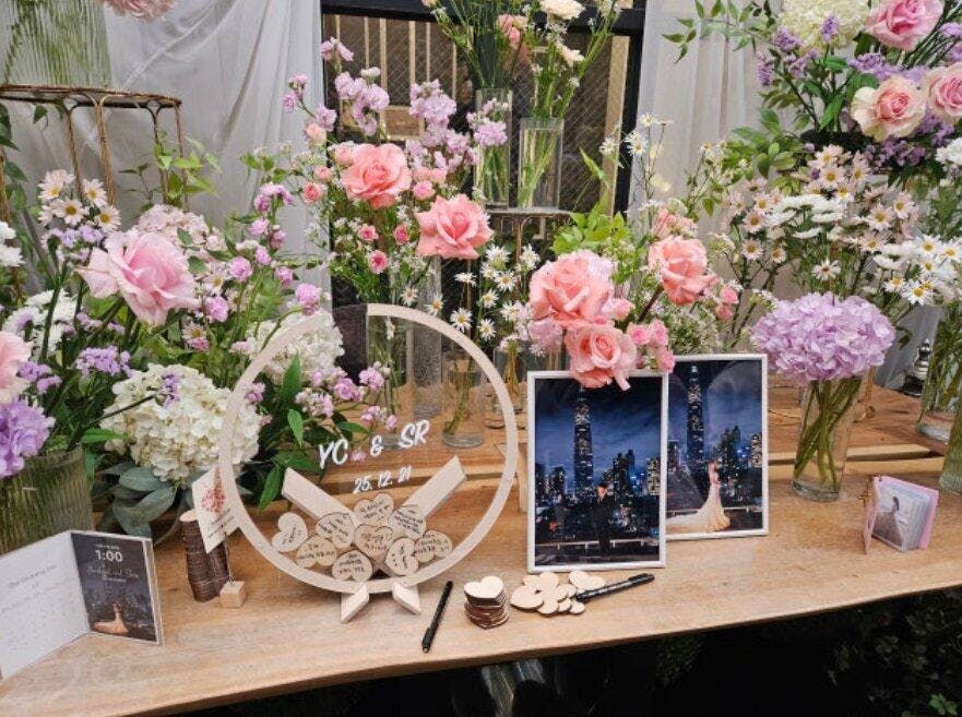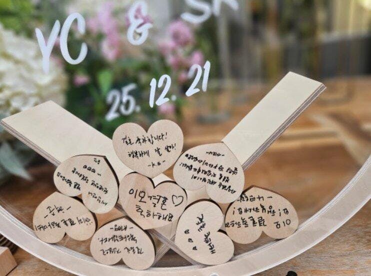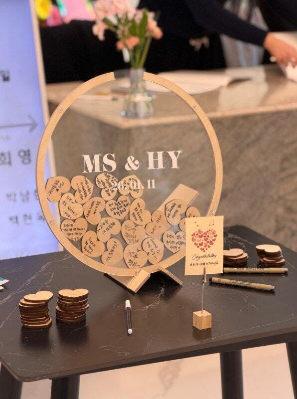 I ordered this immediately after seeing it on Instagram. At first, I was worried it might be too big, but it fit perfectly on our photo table! Our guests were amazed and had so much fun signing it. It created such a wonderful memory for us. The wood finish goes well with everything, so we are now displaying it at home as a keepsake. Love it!😍